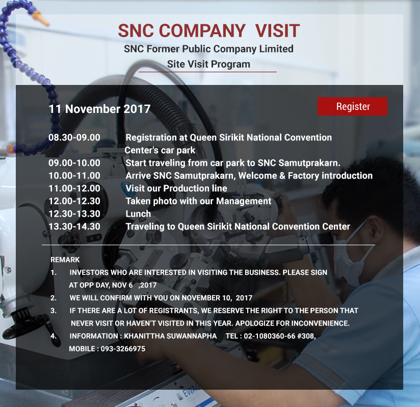 Activities Back to news page 03 November 2017 SNC COMPANY VISIT (SNC Former Public Company Limited) 04 November 2025 บริษัท เอส เอ็น ซี ฟอร์เมอร์ จำกัด (มหาชน) สาขา 2 เข้ารับรางวัล KAIZEN CONTEST 2025 06 September 2025 กิจกรรมวันต่อต้านคอร์รัปชัน 2568 03 September 2025 บริษัท พาราไดซ์ พลาสติก จำกัด และบริษัท เอสเอ็นซี ครีเอติวิตี้ แอนโทโลจี จำกัด เข้ารับรางวัล Industry 4.0 Recognition Awards 2025 28 August 2025 บริษัท อิมมอทัล พาร์ท จำกัด โดย ดร.สมชัย ไทยสงวนวรกุล ประธานกรรมการบริหาร และตัวเเทนจากบริษัทฯ เข้ารับรางวัล Technical Development Award 2024 จาก บริษัท ไดกิ้น อินดัสทรีส์ (ประเทศไทย) จำกัด วันที่ 28 สิงหาคม 2568 11 November 2024 บริษัท เอส เอ็น ซี ฟอร์เมอร์ จำกัด (มหาชน) รับมอบประกาศนียบัตรรับรองการต่ออายุเป็นสมาชิกแนวร่วมต่อต้านคอร์รัปชันของภาคเอกชนไทย (CAC) ครั้งที่ 3 จากสมาคมส่งเสริมสถาบันกรรมการบริษัทไทย (IOD)