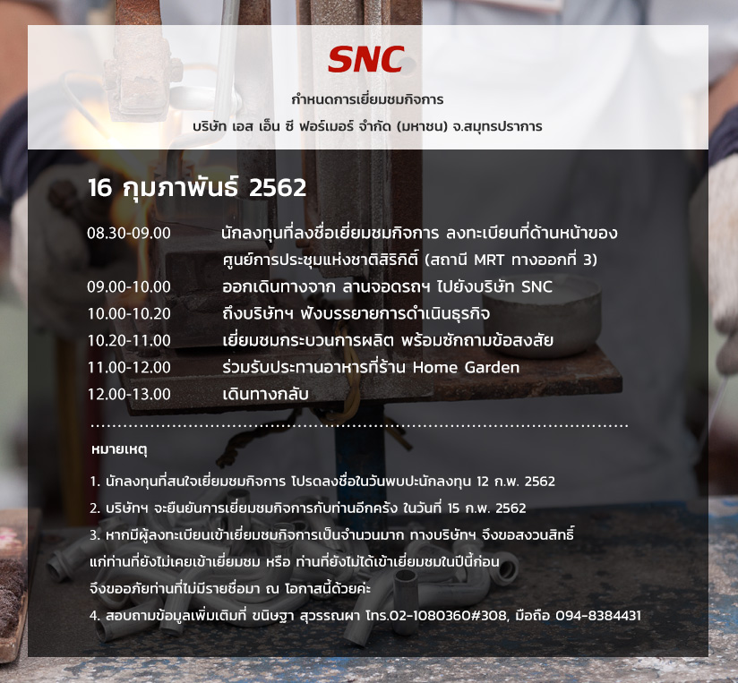 กิจกรรมบริษัท กลับหน้าข่าวสาร 12 กุมภาพันธ์ 2562 กำหนดการเยี่ยมชมกิจการ บริษัท เอส เอ็น ซี ฟอร์เมอร์ จำกัด (มหาชน) 04 พฤศจิกายน 2568 บริษัท เอส เอ็น ซี ฟอร์เมอร์ จำกัด (มหาชน) สาขา 2 เข้ารับรางวัล KAIZEN CONTEST 2025 06 กันยายน 2568 กิจกรรมวันต่อต้านคอร์รัปชัน 2568 03 กันยายน 2568 บริษัท พาราไดซ์ พลาสติก จำกัด และบริษัท เอสเอ็นซี ครีเอติวิตี้ แอนโทโลจี จำกัด เข้ารับรางวัล Industry 4.0 Recognition Awards 2025 28 สิงหาคม 2568 บริษัท อิมมอทัล พาร์ท จำกัด โดย ดร.สมชัย ไทยสงวนวรกุล ประธานกรรมการบริหาร และตัวเเทนจากบริษัทฯ เข้ารับรางวัล Technical Development Award 2024 จาก บริษัท ไดกิ้น อินดัสทรีส์ (ประเทศไทย) จำกัด วันที่ 28 สิงหาคม 2568 11 พฤศจิกายน 2567 บริษัท เอส เอ็น ซี ฟอร์เมอร์ จำกัด (มหาชน) รับมอบประกาศนียบัตรรับรองการต่ออายุเป็นสมาชิกแนวร่วมต่อต้านคอร์รัปชันของภาคเอกชนไทย (CAC) ครั้งที่ 3 จากสมาคมส่งเสริมสถาบันกรรมการบริษัทไทย (IOD)