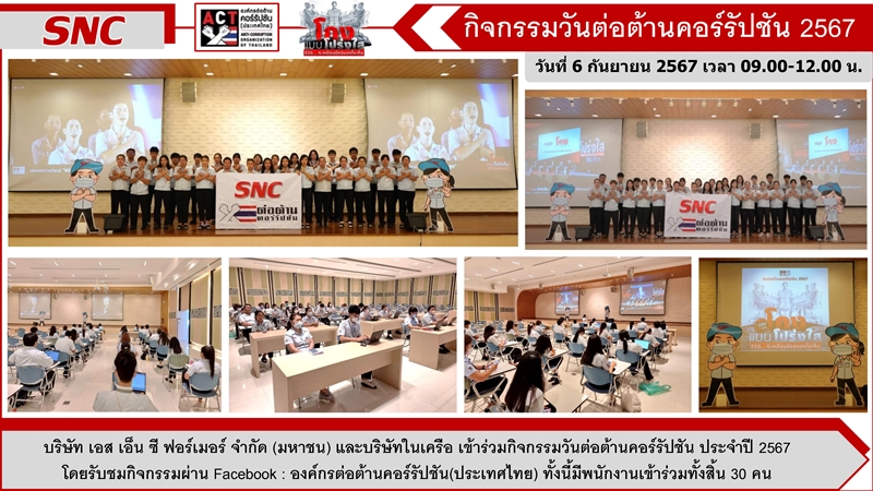 กิจกรรมบริษัท กลับหน้าข่าวสาร 06 กันยายน 2567 บริษัท เอส เอ็น ซี ฟอร์เมอร์ จำกัด (มหาชน) และบริษัทในเครือ เข้าร่วมกิจกรรมวันต่อต้านคอร์รัปชัน ประจำปี 2567 04 พฤศจิกายน 2568 บริษัท เอส เอ็น ซี ฟอร์เมอร์ จำกัด (มหาชน) สาขา 2 เข้ารับรางวัล KAIZEN CONTEST 2025 06 กันยายน 2568 กิจกรรมวันต่อต้านคอร์รัปชัน 2568 03 กันยายน 2568 บริษัท พาราไดซ์ พลาสติก จำกัด และบริษัท เอสเอ็นซี ครีเอติวิตี้ แอนโทโลจี จำกัด เข้ารับรางวัล Industry 4.0 Recognition Awards 2025 28 สิงหาคม 2568 บริษัท อิมมอทัล พาร์ท จำกัด โดย ดร.สมชัย ไทยสงวนวรกุล ประธานกรรมการบริหาร และตัวเเทนจากบริษัทฯ เข้ารับรางวัล Technical Development Award 2024 จาก บริษัท ไดกิ้น อินดัสทรีส์ (ประเทศไทย) จำกัด วันที่ 28 สิงหาคม 2568 11 พฤศจิกายน 2567 บริษัท เอส เอ็น ซี ฟอร์เมอร์ จำกัด (มหาชน) รับมอบประกาศนียบัตรรับรองการต่ออายุเป็นสมาชิกแนวร่วมต่อต้านคอร์รัปชันของภาคเอกชนไทย (CAC) ครั้งที่ 3 จากสมาคมส่งเสริมสถาบันกรรมการบริษัทไทย (IOD)